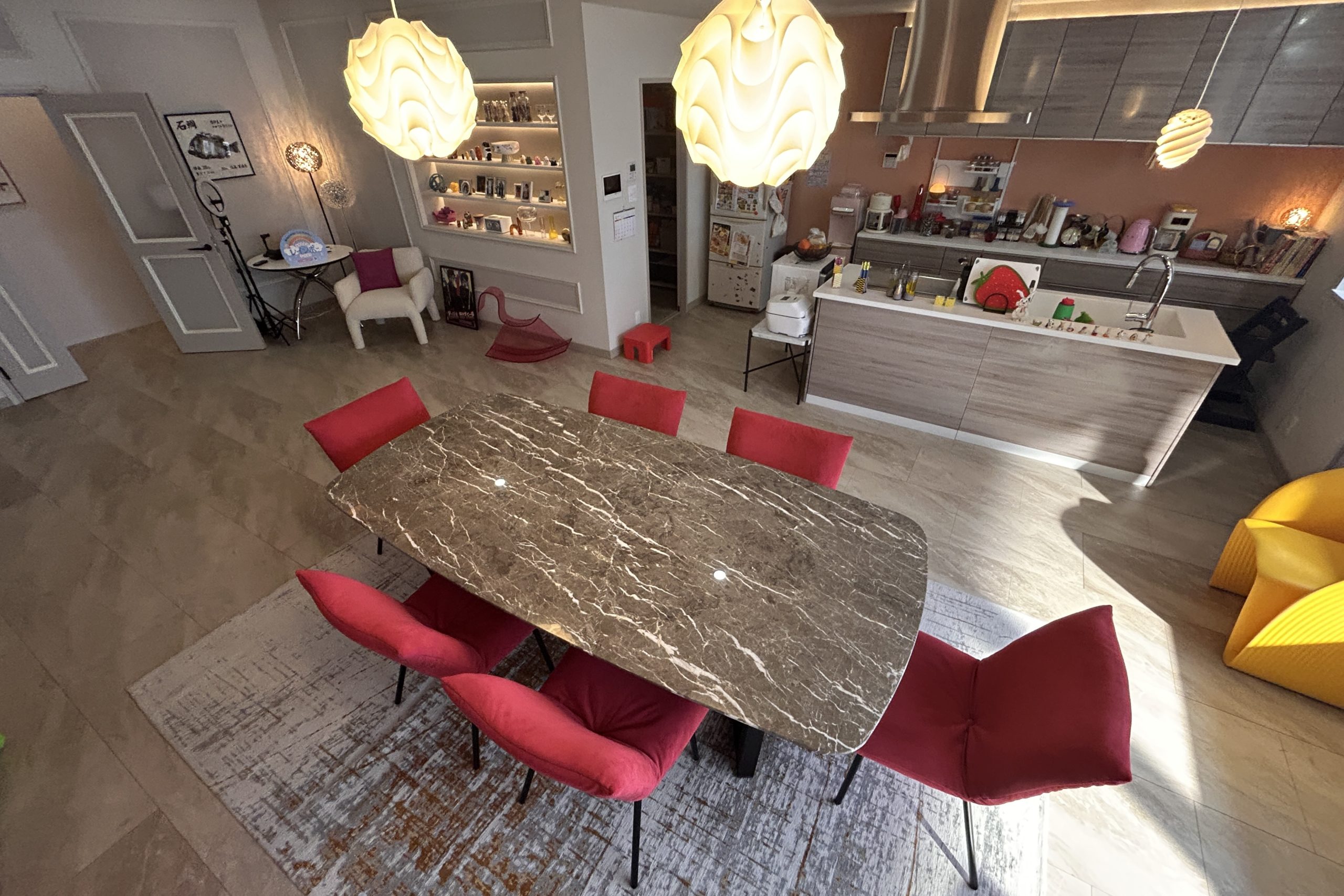 ダイニングチェアやソファ等、大物の家具はビビットなカラーで女性らしいモダンな空間に。 ラグは白やグレーベースで主張し過ぎないのに程良くアクセントのあるデザインをお選びいただきました。